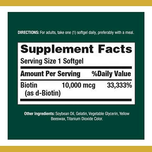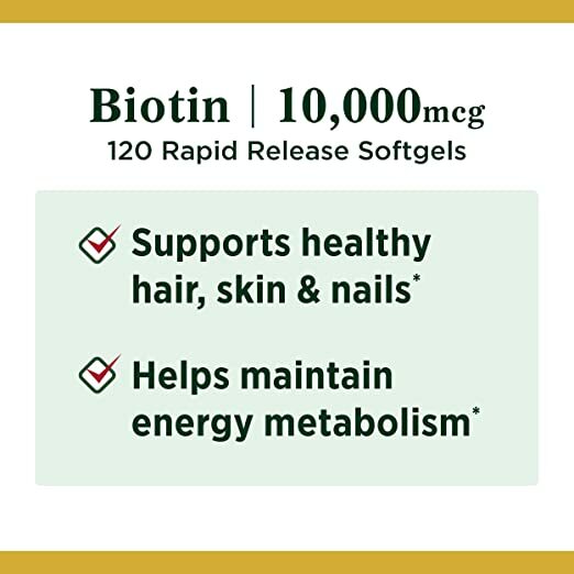 - BIOTIN 10,000 MCG: Nature’s Bounty’s Biotin supplement contains 10,000 mcg rapid release softgels to help support healthy hair, skin and nails, and energy metabolism Biotin is part of the family of B vitamins and supports fat metabolism